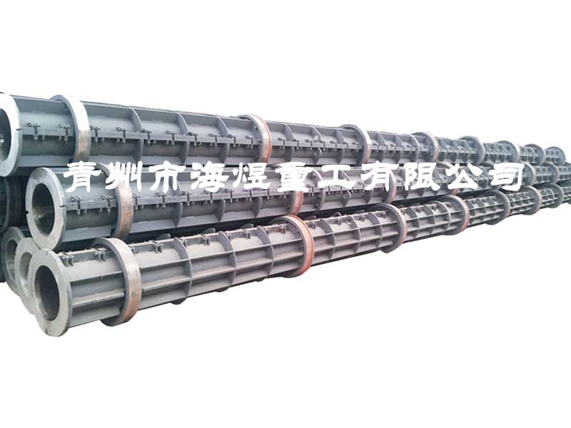 電桿模具為兩半式結構,生產時須先用壓型機把8mm厚的鋼板壓成符合電桿外形尺寸的要求,再借助法蘭、環筋、縱筋加固筒體,使模具能夠承受離心過程中各種作用力,最后把電線桿模具跑輪用車床整體通車,出廠檢驗,合格后即為電桿模具成品。
