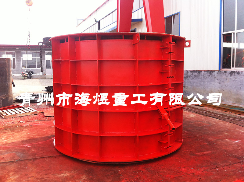 立式振動模具是由可拆裝的鋼外模與附著震動器的鋼內模組成。外模由兩片厚約為5mm左右的鋼板半圓管(直徑20m時為三片)拼制,半圓筒用帶楔的銷栓連接,內模為一整圓筒,下口直徑較上口直徑稍小,以便取出內模。
