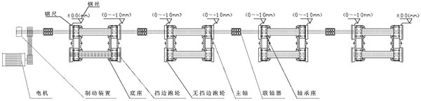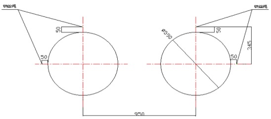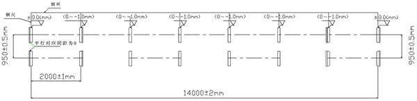 第二次調整:①卸下全部的夾軸器,按照以上粗調的步驟來精調離心機的水平精度;②調整要求:水平方向,調整主、從動輪軸承座旁的調節螺釘使主動軸與副軸中心線在同一水平面上間距為950mm,兩端的寬度差(平行度)≦±0.5mm;垂直方向各輪的水平度誤差±1mm,前后輪略高0.5mm;調整各組跑輪使長度方向中心距為2000mm±1mm,總托輪距累積誤差≦±2mm。③帶擋邊主、副輪與模具接觸面要對應對齊,調整后要鎖緊,防止工作時移位(圖示一);④底部的墊鐵、斜鐵要打緊,緊定好螺母,重新裝好夾軸器,進行第二次灌漿。