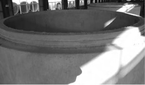 (3)改進效果:經過對混凝土配合比、布料速度、啟振時機、振動頻率、振動時間、碾壓時間及碾壓力的調整和規范,產品成型脫模后的管體外觀質量大為提高,基本消除了管壁表面蜂窩、麻面等缺陷,如圖2所示。 ![]() 圖2 改進后的管壁外觀照片