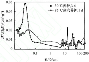 從圖中可以看出,兩者生成物基本相同,大多數(shù)為網(wǎng)狀結(jié)構(gòu)的C-S-H凝膠、六方板狀的Ca(OH)2晶體和針棒狀的鈣礬石(Aft)晶體,但是在水化產(chǎn)物數(shù)量和形貌上存在明顯的差異。免蒸養(yǎng)混凝土中的C-S-H凝膠與粗細(xì)集料結(jié)合緊密,并存在明顯結(jié)晶良好的Ca(OH)2晶體,各種水化產(chǎn)物的尺寸較小,整體結(jié)構(gòu)較為穩(wěn)定、密實(shí),無明顯的孔缺陷。而在蒸汽養(yǎng)護(hù)條件下的混凝土試塊,其內(nèi)部水化產(chǎn)物量較免蒸養(yǎng)情況下更多但形貌較差,其中Ca(OH)2晶體最為明顯,六方板狀結(jié)構(gòu)顯著減少。其主要原因是,在蒸汽養(yǎng)護(hù)條件下,水泥水化速率明顯加快,產(chǎn)物量隨之增多,但是水化產(chǎn)物生成速率與擴(kuò)散速率之間的不協(xié)調(diào)使得水泥水化產(chǎn)物富集與空缺以及水分蒸發(fā)導(dǎo)致的氣泡定向遷移等,使混凝土內(nèi)部結(jié)構(gòu)粗化,存在潛在的結(jié)構(gòu)缺陷。從力學(xué)和耐久性能上分析,較多的水化產(chǎn)物形成的膠凝結(jié)構(gòu)使蒸養(yǎng)混凝土早期的力學(xué)強(qiáng)度提高,但是其內(nèi)部的固有缺陷導(dǎo)致其后期強(qiáng)度發(fā)展乏力,耐久性不如免蒸養(yǎng)混凝土。因?yàn)槊庹麴B(yǎng)混凝土是在合適的溫度養(yǎng)護(hù),并且添加礦粉和硝酸鈣,所以其內(nèi)部結(jié)構(gòu)更為理想。 2. 孔結(jié)構(gòu)分析 膠凝材料的密實(shí)程度對(duì)混凝土的強(qiáng)度和耐久性有著很大的影響,因此以孔徑分布以及孔隙率作為依據(jù)來評(píng)定膠凝材料的密實(shí)程度,進(jìn)而分析混凝土宏觀抗壓強(qiáng)度和耐久性。不同的養(yǎng)護(hù)制度會(huì)對(duì)膠凝材料中各種組分的反應(yīng)產(chǎn)生不同的影響,從而使混凝土內(nèi)部的孔徑分布和孔隙率有著明顯的差異。文獻(xiàn)中把混凝土孔徑分為4類,即無害孔(<20nm)、少害孔(20~50nm)、有害孔(>50~200nm)和多害孔(>200nm)。本文中使用壓汞法對(duì)不同養(yǎng)護(hù)條件下的混凝土進(jìn)行孔結(jié)構(gòu)分析,混凝土孔徑分布及總孔隙率如圖4所示。 ![]() 圖4 不同養(yǎng)護(hù)制度下混凝土的孔徑分布及總孔隙率 由圖可知,免蒸養(yǎng)混凝土的孔結(jié)構(gòu)較蒸養(yǎng)混凝土的更為合理,無害孔和少害孔的總量都明顯多于蒸養(yǎng)混凝土,而且有害孔及多害孔均少于蒸養(yǎng)混凝土。比較兩者的總孔隙率,蒸養(yǎng)混凝土總孔隙率(10.83%)與免蒸養(yǎng)混凝土的總孔隙率(11.21%)相近,但是蒸養(yǎng)混凝土平均孔徑增大,對(duì)混凝土耐久性有極大影響的有害孔和多害孔數(shù)量明顯增加,導(dǎo)致蒸養(yǎng)混凝土的耐久性不及免蒸養(yǎng)混凝土。 四、結(jié)論 本文中對(duì)比分析現(xiàn)有生產(chǎn)用蒸汽養(yǎng)護(hù)混凝土和新開發(fā)的早強(qiáng)免蒸養(yǎng)混凝土的性能,得到以下結(jié)論: 1)適量摻加的礦粉和早強(qiáng)劑的復(fù)合技術(shù)可以生產(chǎn)出滿足混凝土電桿早期強(qiáng)度要求的免蒸養(yǎng)混凝土。 2)免蒸養(yǎng)混凝土在常溫下的強(qiáng)度發(fā)展雖然與蒸養(yǎng)混凝土存在一定的差距,但是其耐久性更好,與相同強(qiáng)度蒸養(yǎng)混凝土相比,其動(dòng)彈性模量損失減小2.33%,質(zhì)量損失率減小2.17%,抗氯離子滲透能力提高24.10%。 3)與蒸汽養(yǎng)護(hù)相比較,免蒸養(yǎng)混凝土中水化產(chǎn)物形貌及分布狀態(tài)優(yōu)于蒸養(yǎng)混凝土,其產(chǎn)物結(jié)晶更完整,缺陷更少;內(nèi)部孔結(jié)構(gòu)得到優(yōu)化,無害孔及少害孔增加,微觀結(jié)構(gòu)更為密實(shí)。 |